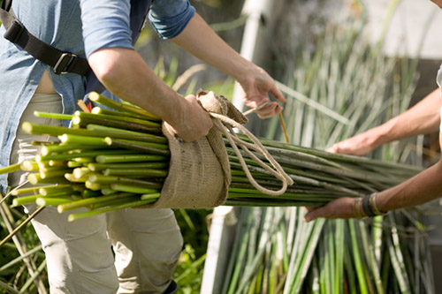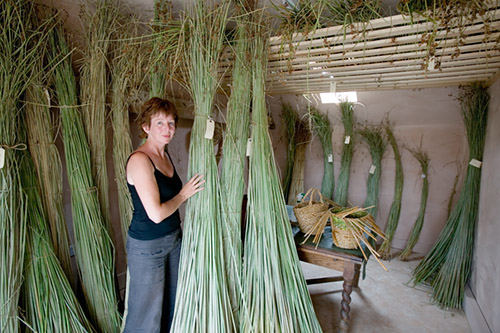 Bundles of rushes drying in the RushWorks workshop at Gold Hill Organic Farm, Child Okeford, North Dorset