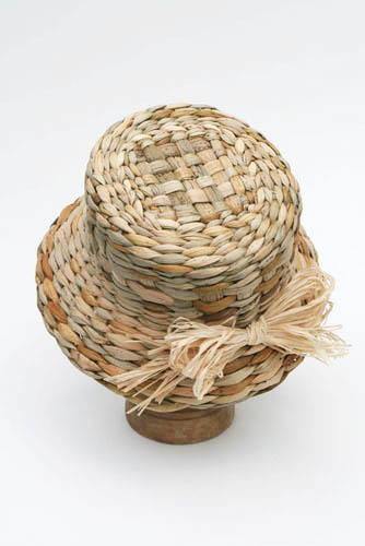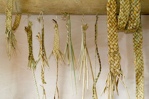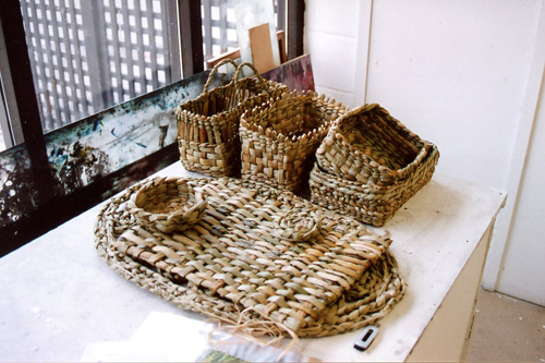A selection of baskets made by weaving around wooden blocks or other formers or by plaiting or twisting